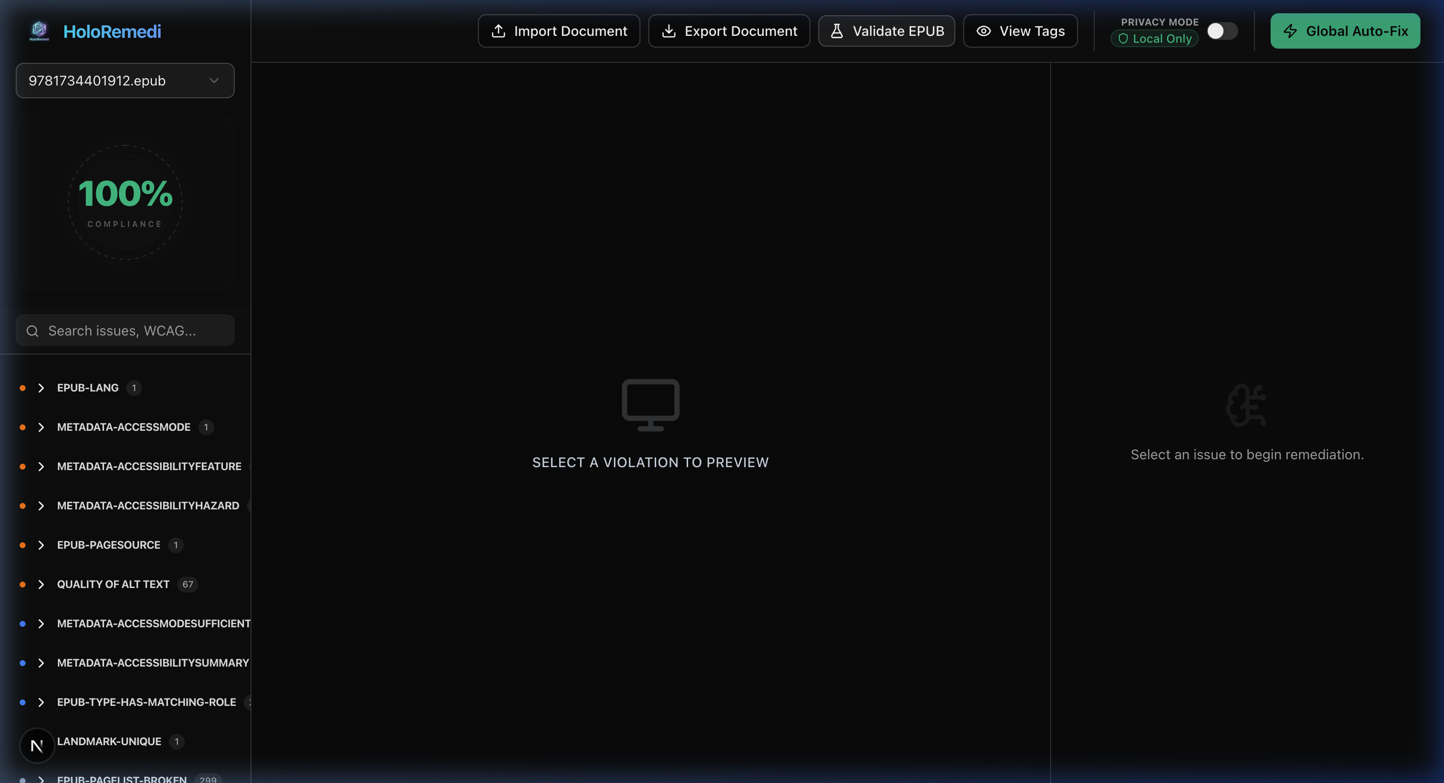 See every fix in context. HoloRemedi renders your EPUB or PDF live alongside the remediation panel so nothing is fixed blindly.